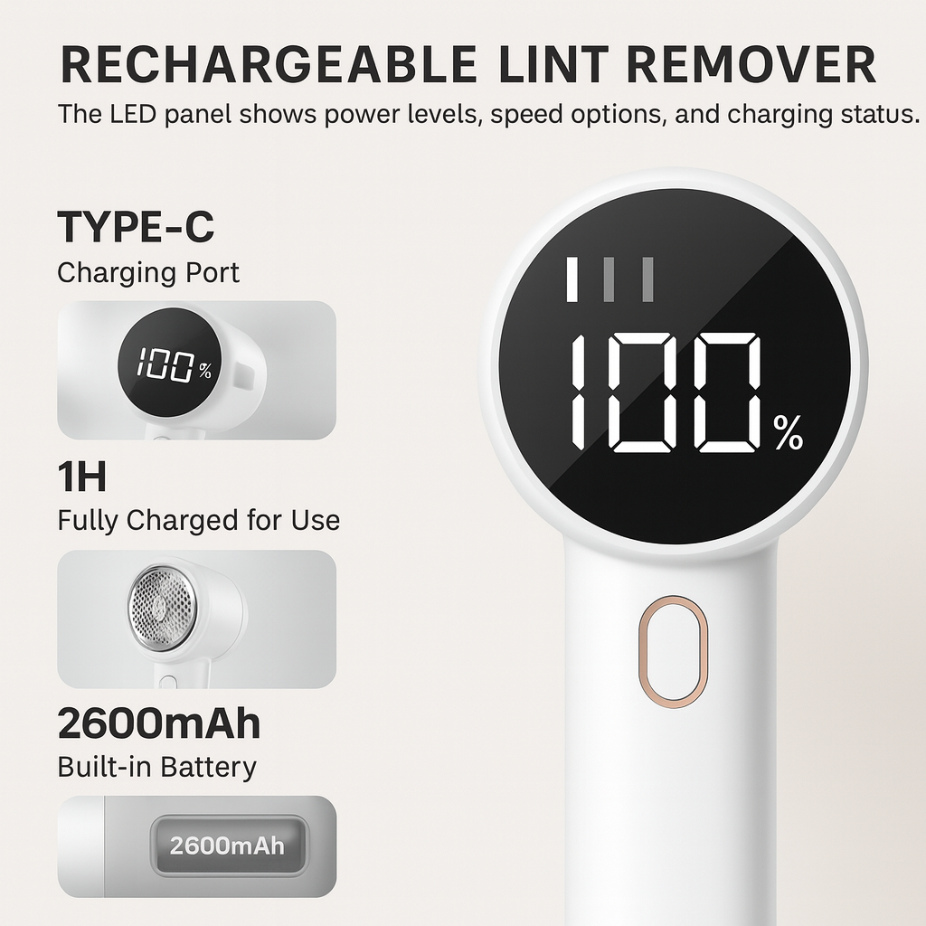 Keeping your device powered is easy. Our Electric Lint Remover uses a convenient Type-C port and fully charges in about one hour. Just plug it in, let it charge, and it’s ready for smooth, powerful use whenever you need it. The power indicator lets you know when it’s fully charged, making the process quick and effortless.